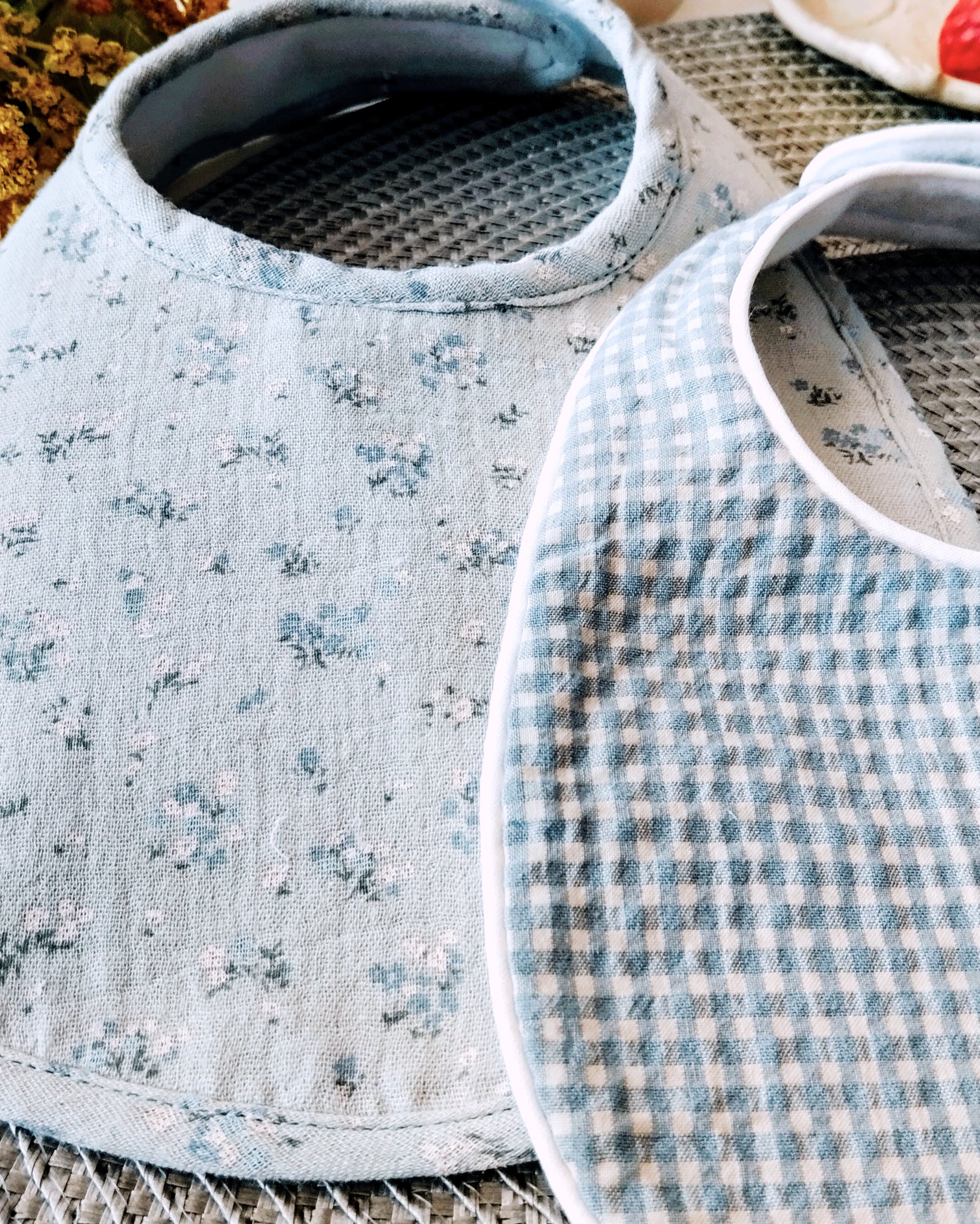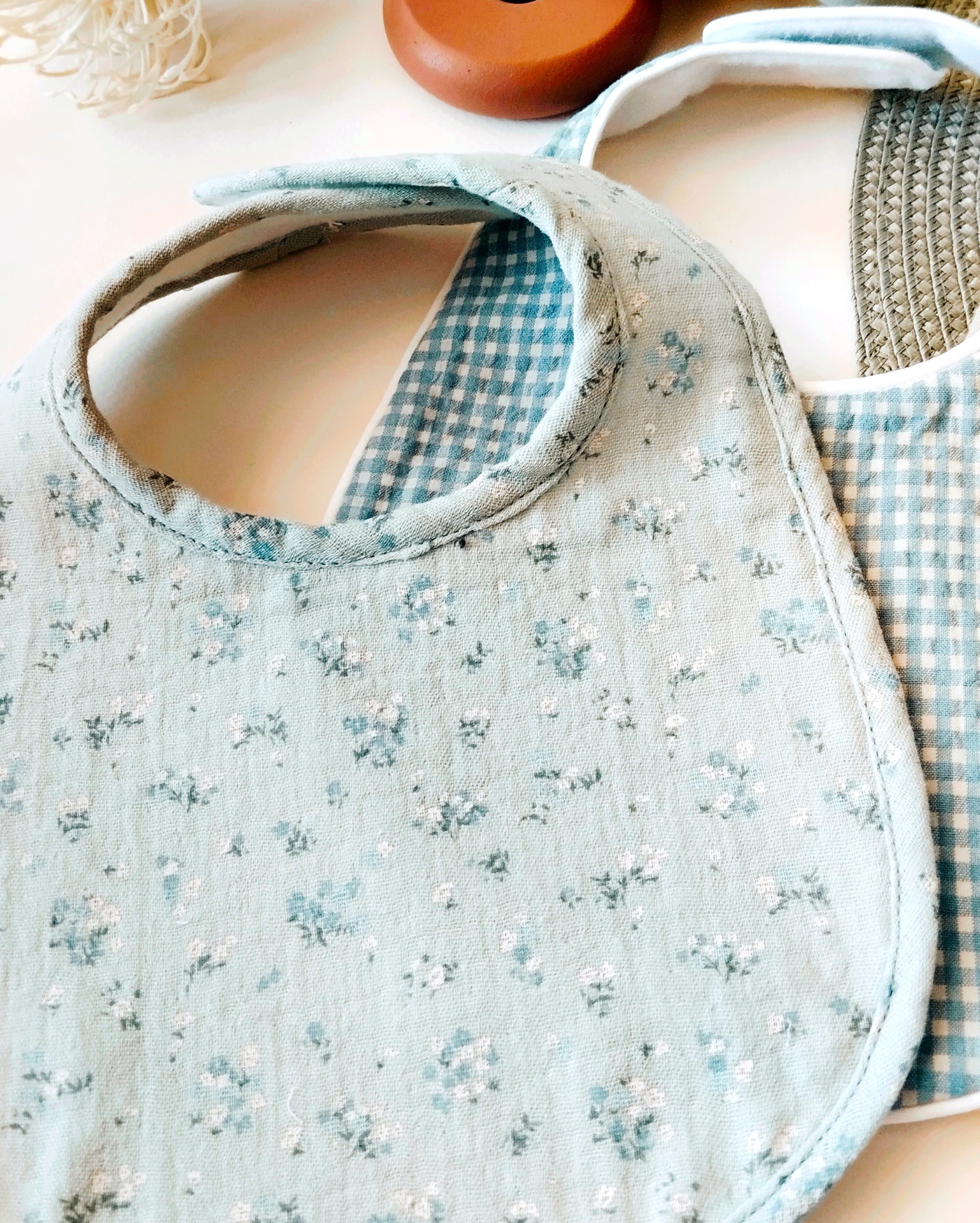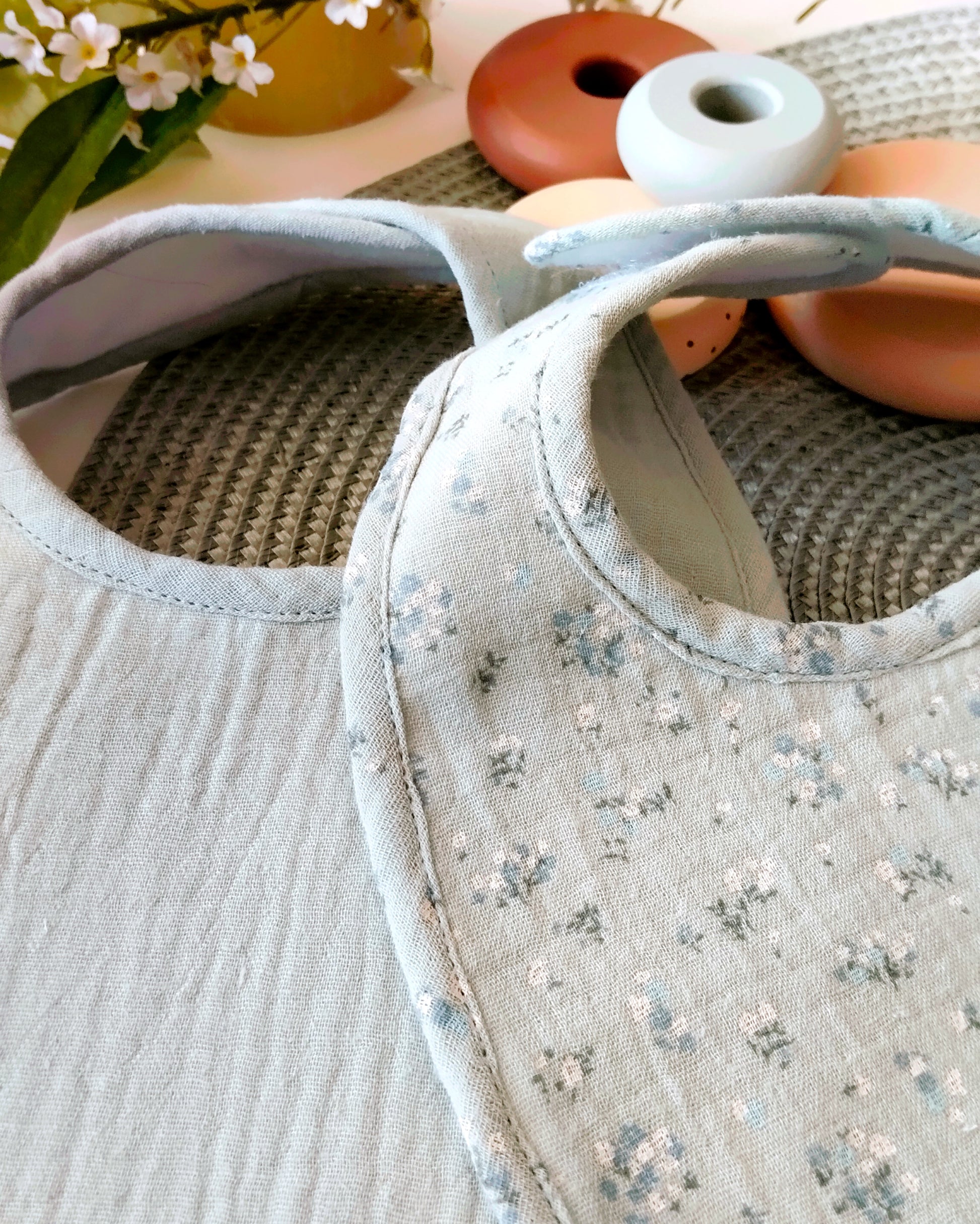 Puedes comprarlo sólo o combinado con los otros dos modelos de la colección YEYÉ: el clásico vichy y de color verde liso o combinarlos con baberos de otras colecciones según tu estilo.